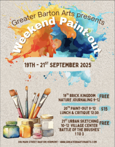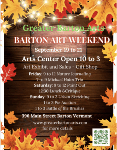 * Open for events and classes contact GreaterBartonArts@ gmail.com or Adrien at 802-525-3740
